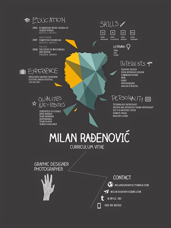 Oto przykładowe CV znalezione w sieci, które mogą Cię zainspirować, do stworzenia własnego, kreatywnego CV. Kliknięcie w dowolny obrazek przeniesie Cię do twórcy tego małego dzieła, lub do strony na której je znalazłam. Szczerze powiem, że nie wiedziałam, że można w taki sposób tworzyć CV! W mojej szkole nauczono mnie jednego wzoru. Kiedy oddawaliśmy te CV (bo były na ocenę) poprawiałam je z trzy razy. Bo języki mają być przed zainteresowaniami, bo czcionka zła, bo to, bo tamto. Nasza nauczycielka powtarzała, że tylko schemat, który ona nam przedstawiła jest poprawny. Oczywiście w grę nie wchodziły żadne udziwnienia, a gdzie tam kolory! Dlatego też tak bardzo zachwyciły mnie poniższe prace i mam nadzieję, że zachwycą i Ciebie!
